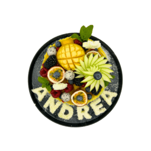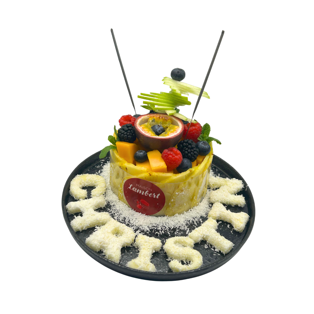 Con la opción Personalización Maison Lambert puedes añadir palabras, nombres o mensajes hechos directamente con fruta, perfectos para cumpleaños, aniversarios, sorpresas o cualquier evento especial.